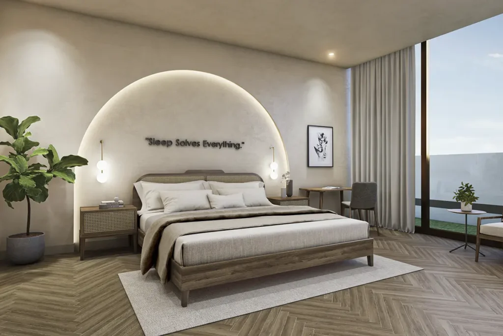 Large format tiles in living, dining, and bedroom